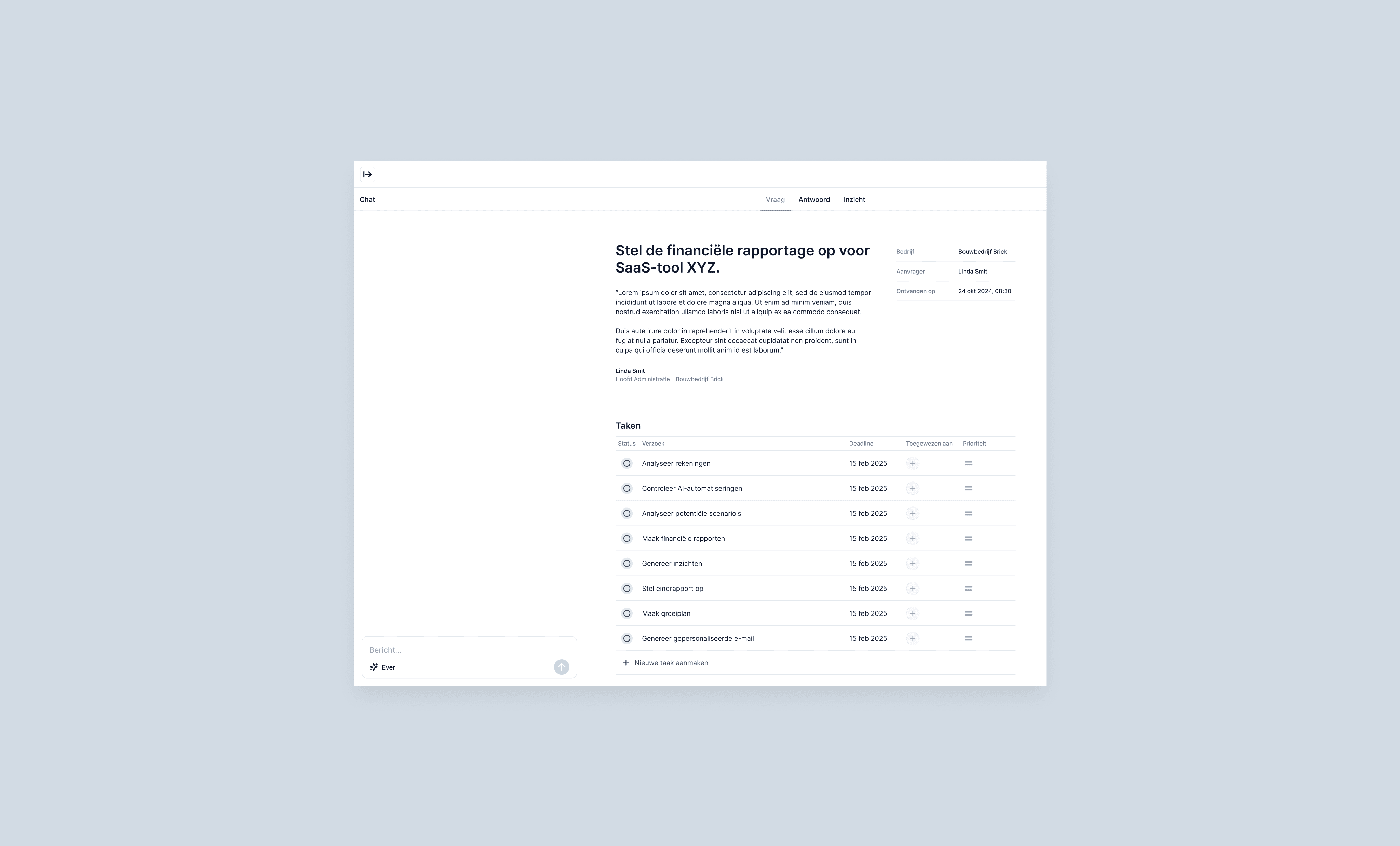 The complete design was built by development. During user tests, entrepreneurs could work with the AI assistants without explanation, which confirmed that the interaction was clear enough. Test users also indicated that the interface is calmer and more organized than the accounting software they're used to.