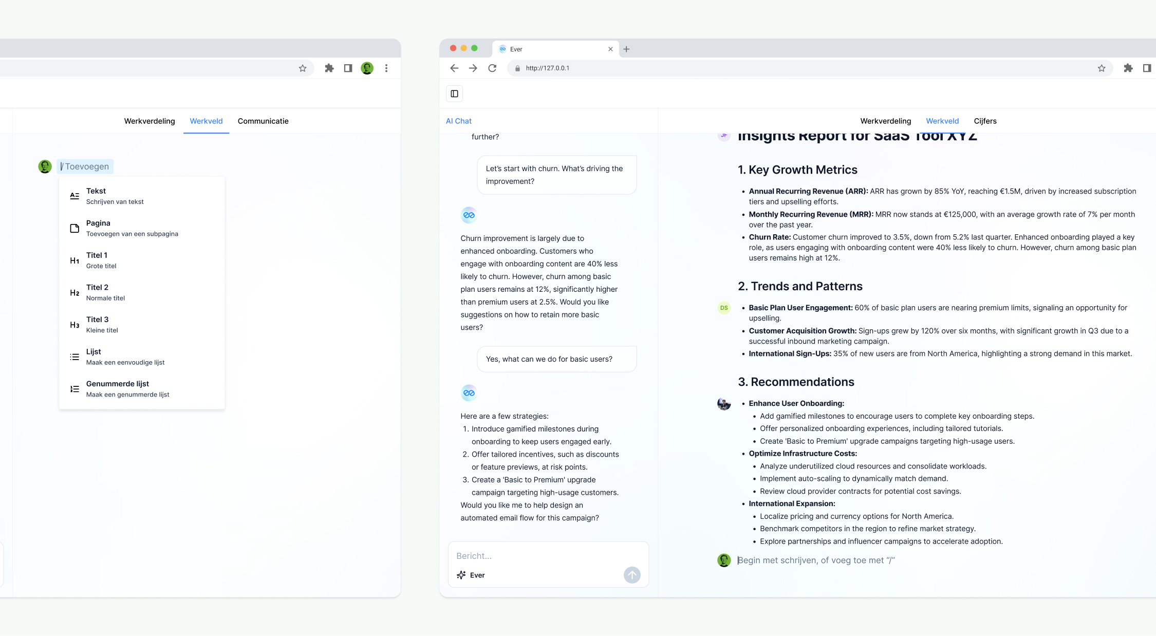 Tijs, de founder, kwam naar me toe met een idee voor Ever. Het concept stond, maar ik mocht het omzetten naar een productontwerp. Met Tijs keek ik naar de businesskant, terwijl ik met de developers checkte of alles goed aansloot bij de technische mogelijkheden van AI.